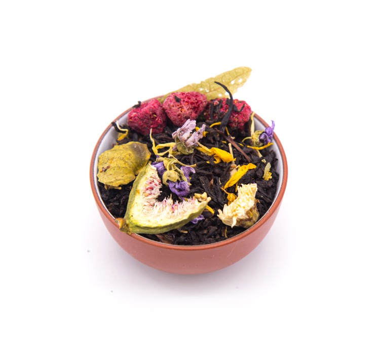 Чай черный индийский, плоды шиповника, ягоды малины, слайсы инжира, липа, хризантема, цветы мальвы, лепестки календулы, аромат фруктового сада